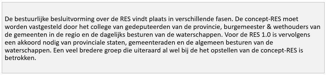 De concept-RES bevat ambities en uitgangspunten voor de manier waarop de betreffende regio zijn aandeel aan de afspraken in het Klimaatakkoord kan leveren. Een volgende stap is verdere uitwerking van de gekozen strategie in een RES 1.0. Deze moet voor 1 juli 2021 klaar zijn: een jaar na oplevering van de concept-RES. In de RES 1.0 worden zaken meer geconcretiseerd. Voor inwoners wordt daarmee steeds duidelijker wat er gaat veranderen in hun directe woon- en leefomgeving. Nieuwe vormen van elektriciteitsopwekking vragen ruimtelijke inpassingen waarover het laatste woord nog niet is gezegd. Mogelijkheden voor duurzame warmtebronnen en manieren voor vraagreductie zijn meestal minder zichtbaar in het landschap. Wel hebben ze binnenshuis soms vergaande gevolgen voor bewoners. De afwegingen voor meer concretisering in de RES 1.0 vindt plaatst op basis van technische en economische aspecten, ruimtelijke gevolgen en draagvlak bij bewoners. Afstemming met een bredere groep stakeholders met zeer diverse achtergronden is daarbij essentieel. Dat in de beperkte tijd voor elkaar krijgen, vraagt om een strakke planning van doelgerichte activiteiten.